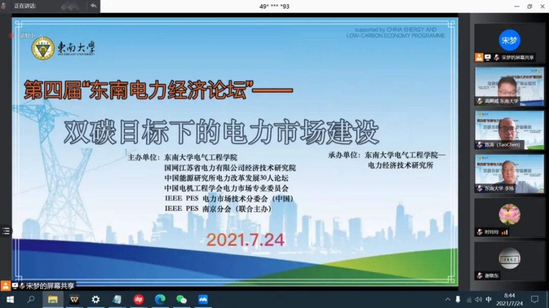 随着碳中和、碳达峰目标的提出和电力市场化改革的提速,可再生能源将逐步成为我国的主力电源,并促进市场化环境下“新型电力系统”的转型建设。2021年7月24日,由我院联合国网江苏省电力公司经济技术研究院、中国能源研究会电力改革发展30人论坛、中国电机工程学会电力市场专委会、IEEE PES电力市场技术分委会(中国)、IEEE PES 南京chapter联合举办、学院电力经济技术研究所承办的“第四届东南电力经济论坛-双碳目标下的电力市场建设”通过腾讯会议平台顺利举行,会议中针对电力系统经济运行和双碳目标下的电力市场建设等问题展开了一系列深入讨论交流。与会专家、学者的精彩报告深入探讨了如何将电力市场经济学理论与我国的具体实际相结合,如何考虑电力市场与碳交易市场、可再生能源配额市场的耦合交互,如何促进清洁能源加速转型并赋予新的市场机制设计。