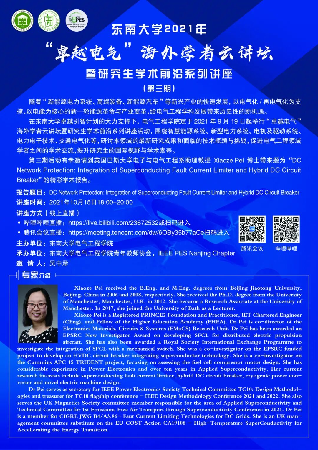 第三期活动有幸邀请到英国巴斯大学电子与电气工程系助理教授Xiaoze Pei博士带来题为“DC Network Protection: Integration of Superconducting Fault Current Limiter and Hybrid DC Circuit Breaker”的精彩学术报告。